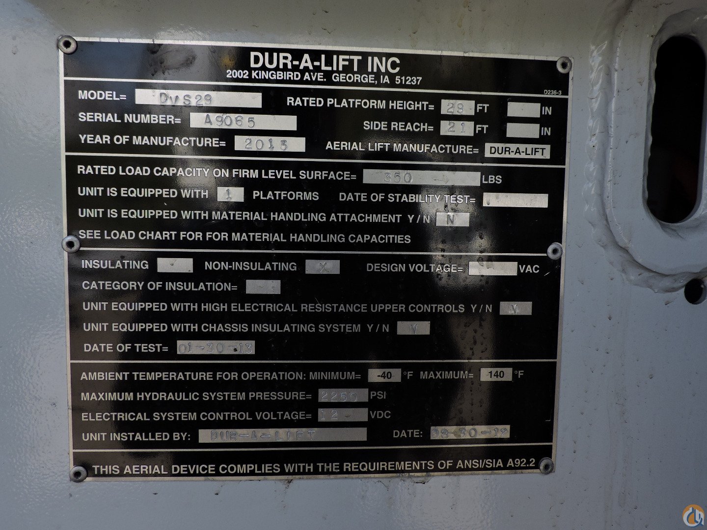 DURALIFT DVS-29TS equipped as follows: